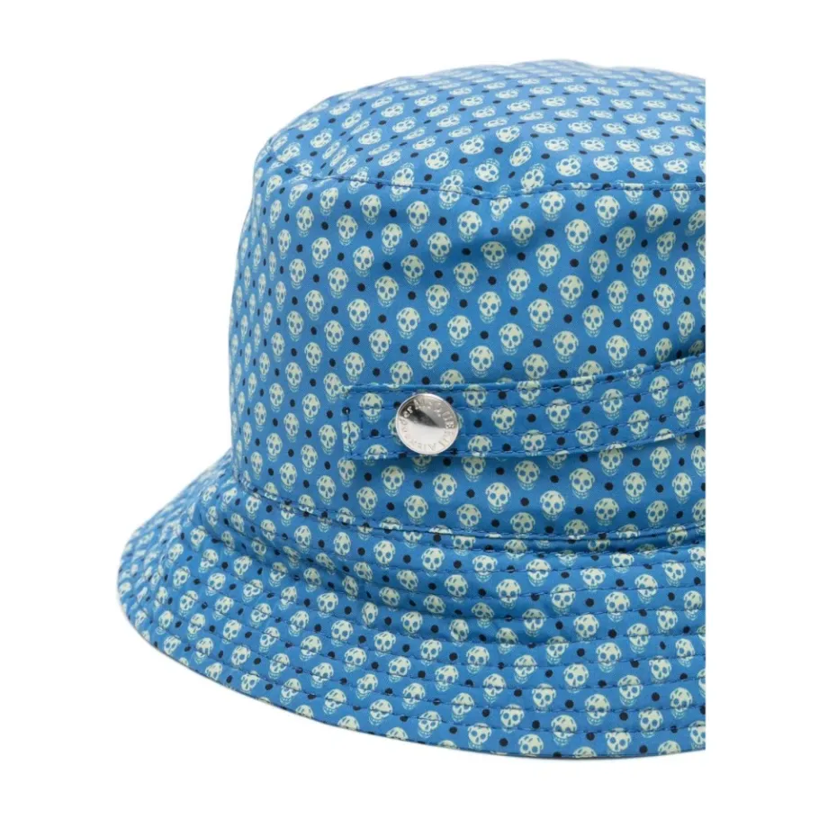 Voeg een vleugje edgy stijl toe aan je look met deze Alexander McQueen Blue Skull-print bucket hat. Gemaakt van een mix van polyamide en polyester, heeft deze hoed een brede rand, skull print, geborduurd logo aan de voorkant, oogjes en riem en drukknoopsluiting. De katoenen voering zorgt voor comfort en ademend vermogen. Perfect voor de modebewuste man.