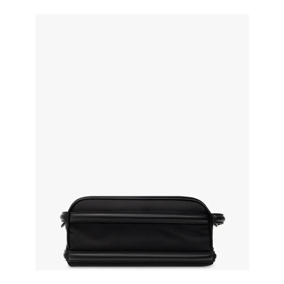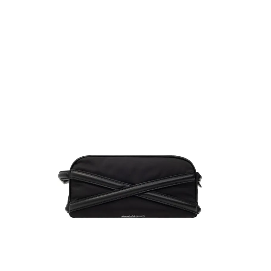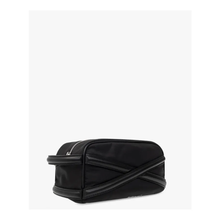 Zwarte toilettas van Alexander McQueen. Afgewerkt met leer, heeft dit model een ritssluiting, opgestikte strepen, logo print, decoratieve zijhandvatten, achterzak, zilverkleurige metalen hardware en één interne compartiment met één kaartsleuf.Hoogte: 13cmBreedte: 26cm