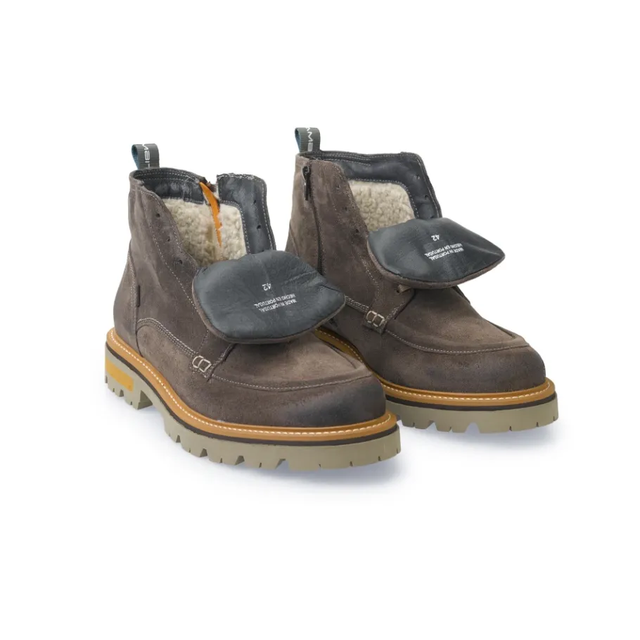 De ambitieuze VET Veter Warme Laars is een relaxte suède laars, ontworpen voor koudere dagen. Hij combineert een oversized commandozool met een warme voering van shearling voor praktisch gebruik in alle seizoenen bij koud weer. Belangrijkste kenmerken: Bruin | Taupe | Suède | Warme voering van shearling | Ton-sur-ton veters | Logo gegraveerd op de schacht | Oversized commandozool | Contrasterend gekleurd zooldetail | Grosgrain lint | Relaxed silhouet | Afmetingen en pasvorm: Relaxte pasvorm | Samenstelling en onderhoud: Bovenwerk: Leer (suède) | Voering: Leer, Textiel | Buitenzool: Rubber | Gebruik speciale producten of laat de reiniging uitvoeren door professionals.