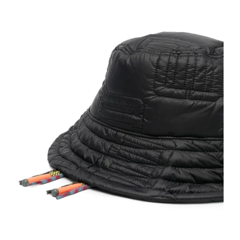 Blijf stijlvol en comfortabel met deze zwarte multi-koord gewatteerde bucket hat van AMBUSH. Ontworpen voor mannen, heeft deze hoed een gewatteerd paneel en een smalle rand. De verstelbare koordlengte zorgt voor een perfecte pasvorm. Gemaakt van 100% polyester en 100% polyamide, is deze hoed zowel als comfortabel.