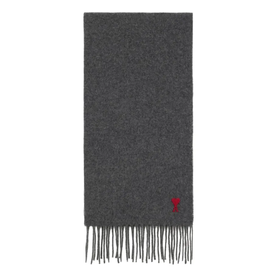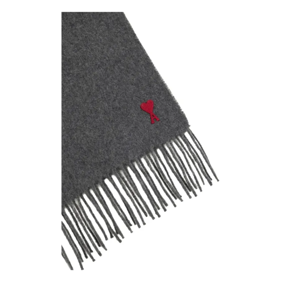 Blijf warm en stijlvol met deze middengrijze wollen wintersjaal van Ami Paris. Met een gevilt afwerking, kenmerkend Ami de Coeur monogrammotief, franje rand en rechthoekige vorm.