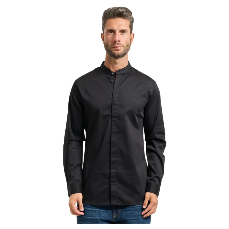 Upgrade je casual stijl met dit heren Armani Exchange overhemd met opstaande kraag en verborgen knoopsluiting. Gemaakt van effen katoen, is dit overhemd een veelzijdige toevoeging aan je garderobe. Het model is 185 cm lang en draagt maat M.