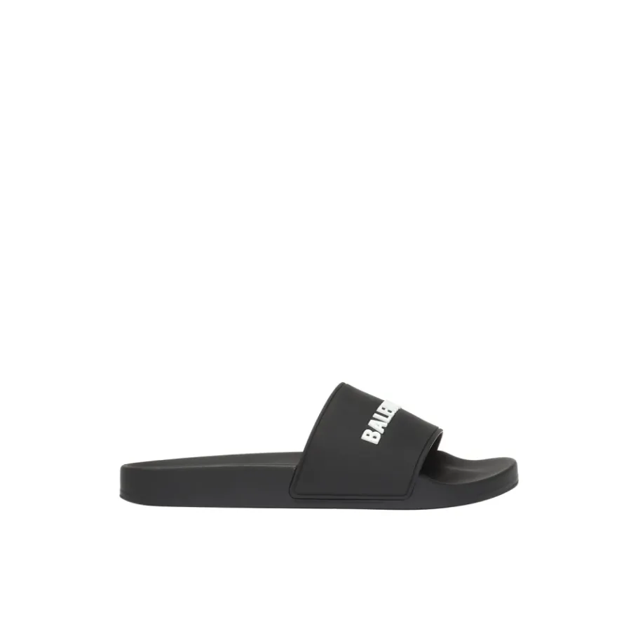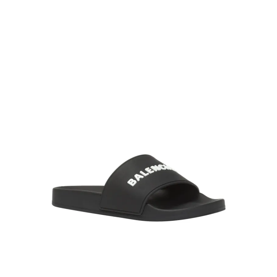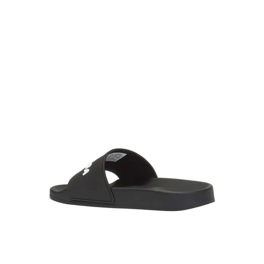 Zwarte slides van Balenciaga met reliëf wit logo-applicatie en witte rubberen zool.