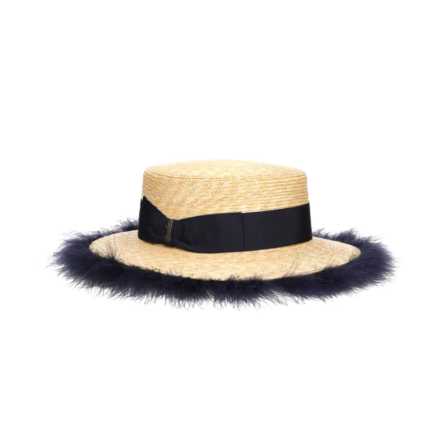 Upgrade je stijl met deze Borsalino Cappello Magiostrina strohoed met een maraboe veer onder de rand. Gemaakt in Italië met een gevlochten stro-ontwerp, een platte rand van 5,5 cm, een 4 cm grosgrain band en een gouden Borsalino-logo. Let op: de werkelijke kleur kan licht variëren door verlichting. BORSALINO.