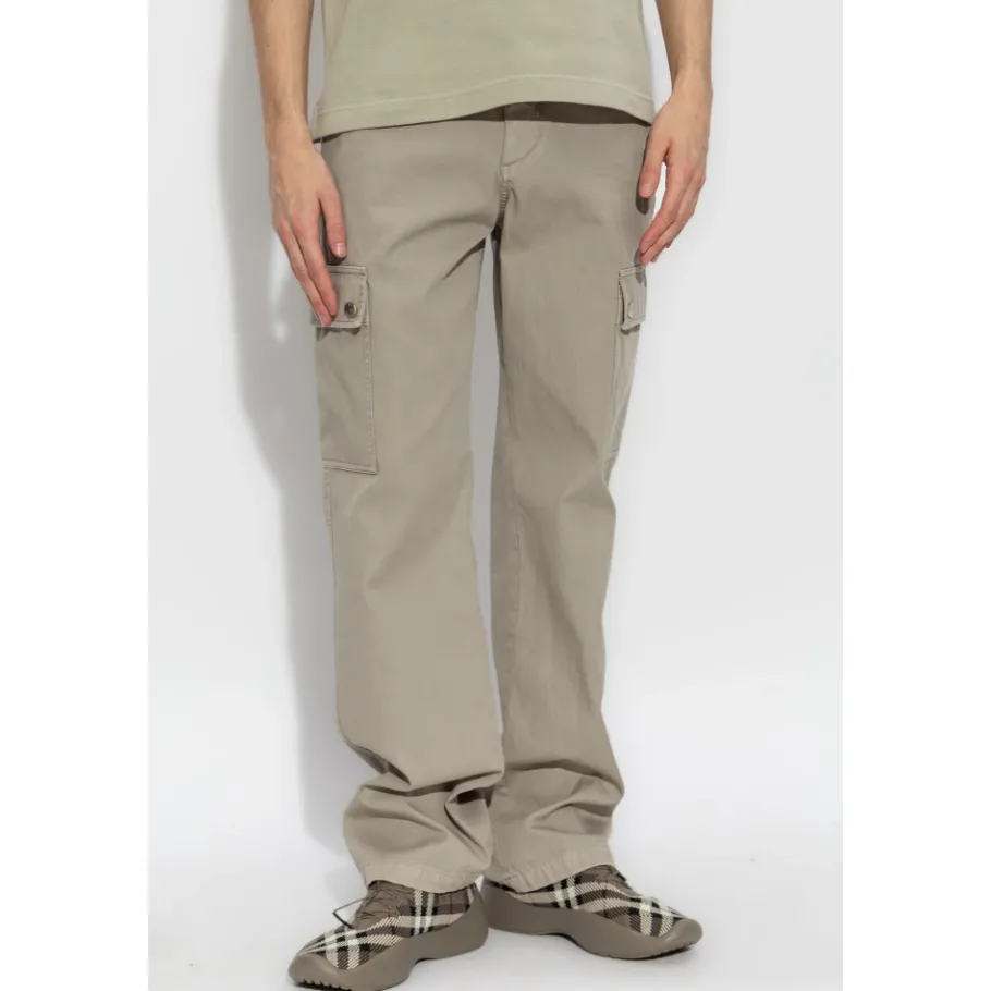 De Cotton Cargo Broek van Burberry combineert stijl en functionaliteit met een klassieke beige tint en katoenen constructie. Perfect voor casual uitstapjes, deze broek biedt comfort en een vleugje exclusiviteit met het subtiele designerlogo. Belangrijkste kenmerken: Beige | Katoen | Ruime klepzakken met drukknoopsluiting | Wijde pijpen | Subtiel designerlogo op de drukknoop | Afmetingen en pasvorm: Regular fit | Samenstelling en onderhoud: 100% katoen | Machinewas koud, droogtrommel laag