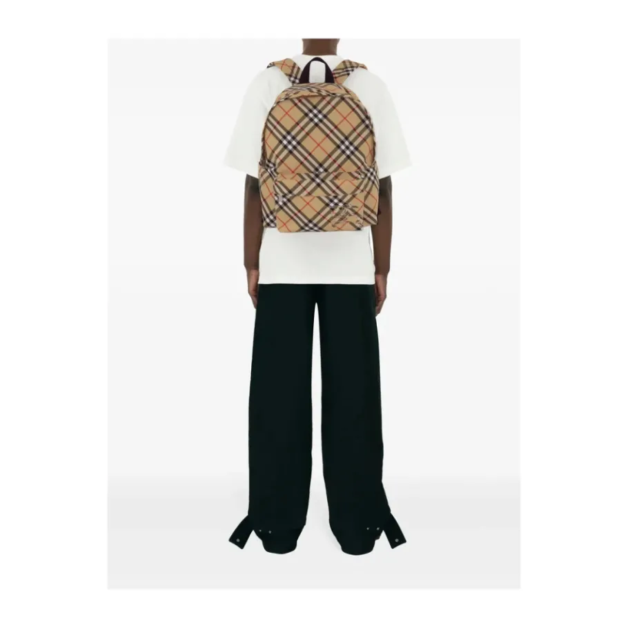 Upgrade je stijl met deze Burberry-rugzak met het iconische beige nova check-patroon en het kenmerkende Equestrian Knight-motief. Ontworpen voor mannen, het heeft een enkele bovenste handgreep, twee verstelbare schouderbanden en meerdere compartimenten voor eenvoudige organisatie. Gemaakt van een hoogwaardige polyester en polyurethaan mix, is deze rugzak zowel stijlvol als functioneel. Afmetingen: Diepte – 14,0 cm, Hoogte – 41,0 cm, Breedte – 35,0 cm.