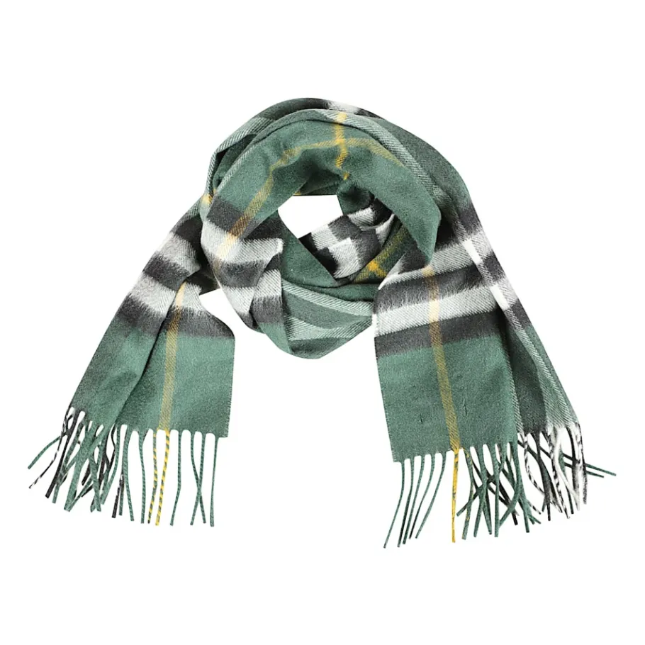 Upgrade je winterstijl met de Burberry kasjmiersjaal voor heren. Dit klassieke accessoire heeft een nauwgezet vervaardigd ruitpatroon in diep flesgroen, zwart, wit en een discrete gele accent, wat verfijning en uniekheid uitstraalt.