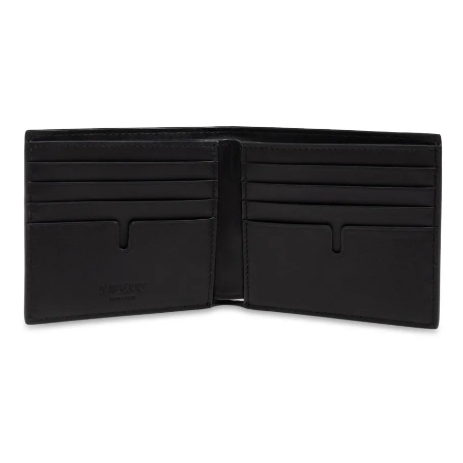 De Burberry leren portemonnee combineert generfd kalfsleer met een opvallende ridderafbeelding voor een verfijnd, alledaags accessoire dat stijl en functionaliteit combineert. Belangrijkste kenmerken: Zwart | Kalfsleer | | Krasbestendige textuur | Bi-fold ontwerp | Meerdere kaartsleuven | Muntvak | Biljetvak | Generfde textuur | Veelkleurige ridder-op-paard afbeelding aan de voorkant | BURBERRY logo in reliëf aan de binnenkant | Rechthoekige, opvouwbare vorm | Afmetingen: Breedte: 10 cm | Lengte: 11 cm | Samenstelling en onderhoud: 100% kalfsleer | Reinigen met een droge doek.