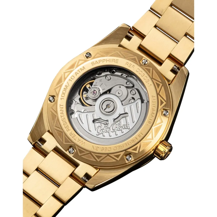 Dit luxueuze herenhorloge straalt elegantie en verfijning uit. Met zijn ronde roestvrijstalen kast en een diameter van 42 mm oogt het zowel opvallend als tijdloos. De goudkleurige roestvrijstalen armband en bijpassende gouden wijzerplaat geven het horloge een exclusieve en nobele uitstraling. De praktische vouwsluiting zorgt niet alleen voor een veilige pasvorm, maar garandeert ook hoog draagcomfort. Het krasbestendige saffierglas beschermt de wijzerplaat en zorgt voor een heldere en leesbaarheid. Aangedreven door een nauwkeurige automatische beweging gebruikt het horloge de beweging van de drager om de tijd betrouwbaar weer te geven. Met een waterbestendigheid van 10 ATM is het ook geschikt voor watersporten zoals zwemmen of snorkelen. Dit horloge is de perfecte keuze voor modebewuste mannen die hoogwaardige materialen en vakmanschap van topklasse waarderen.