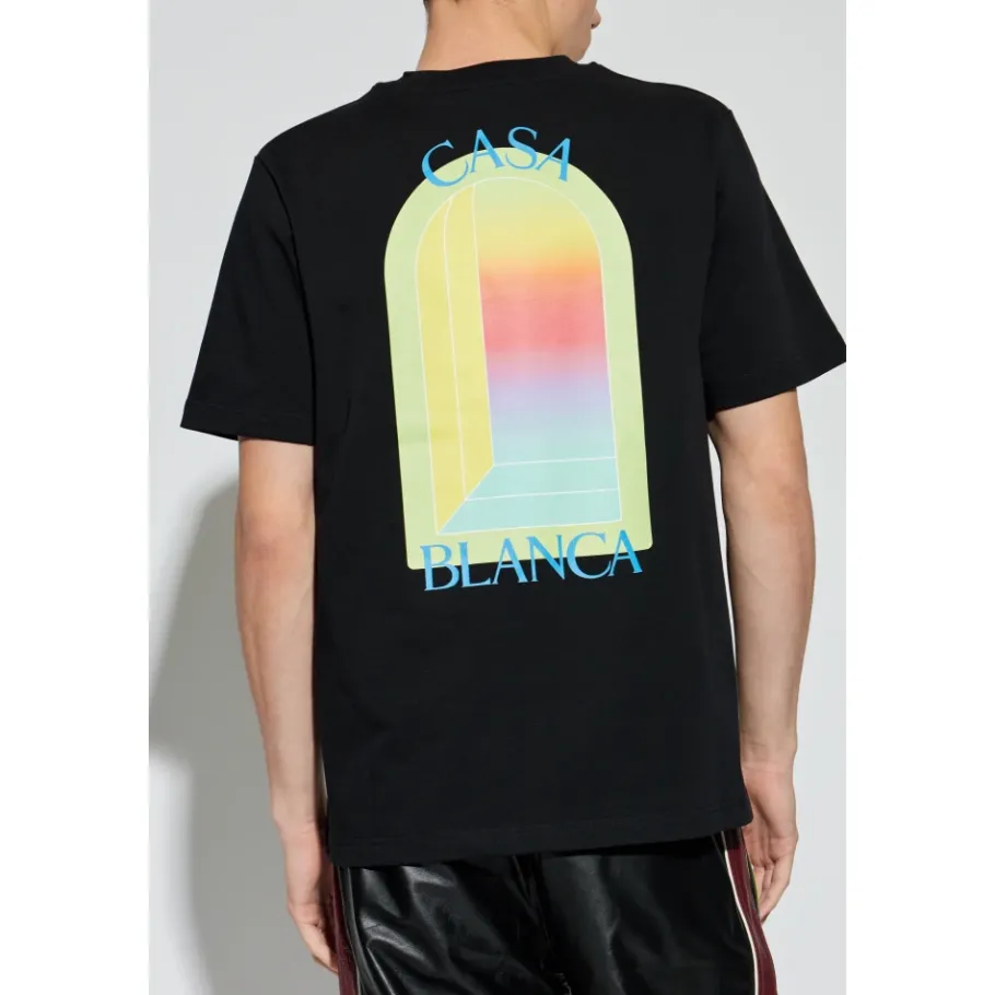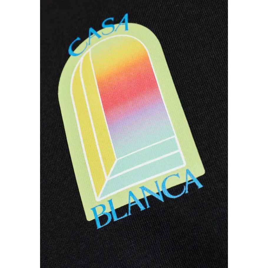 De Casablanca L’Arche T-shirt met korte mouwen combineert de kenmerkende boog-graphic van het merk met een klassieke ronde hals voor een verfijnde casual look. Gemaakt van glad katoenen jersey, biedt het een balans tussen opvallende details en dagelijks comfort. Belangrijkste kenmerken: Zwart | Katoen | Comfortabel | | Gladde jersey afwerking | Ronde halslijn | Korte mouwen | Subtiele boogprint op de borst met gradiënt effect | Groot motief op de rug met blauwe “CASA BLANCA” inscriptie | Contrasterende gele, roze en paarse grafische details | Afmetingen & pasvorm: Lengte model: 193 cm | Borst: 95 cm | Taille: 82 cm | Heupen: 93 cm | Model draagt maat: L | Samenstelling & onderhoud: 100% katoen | Fijne machinewas.