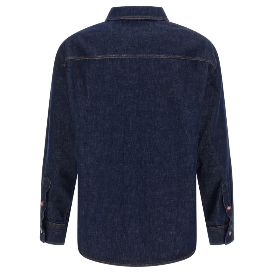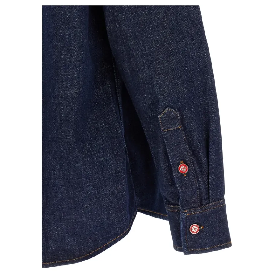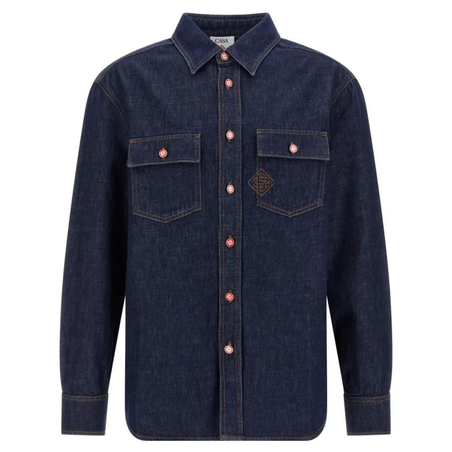 Casablanca katoenen denim shirt met contrasterende stiksels en logo borduursel. Een veelzijdig overhemd met knoopsluiting aan de voorkant, opgestikte zakken en lange manchetten voor dagelijks gebruik. Belangrijkste kenmerken: Blauw | Katoenen denim | Opgestikte zakken | Metalen knoopsluiting aan de voorkant | Lange manchetten | Contrasterende stiksels | Logo borduursel