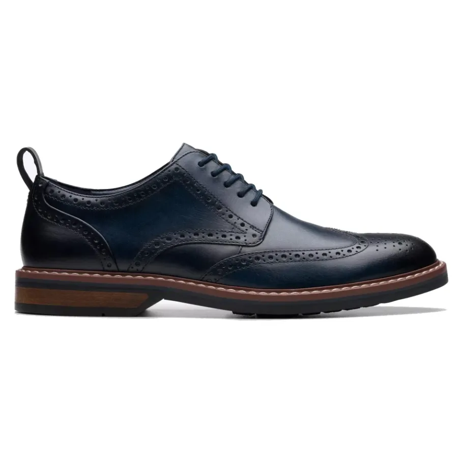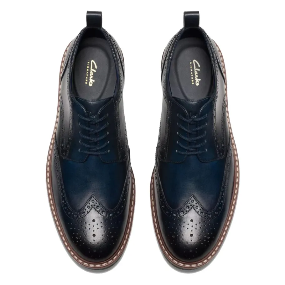 Stap in stijl met Clarks Aldwin Limit veterschoenen voor heren in blauw leer. Elegante brogue-details, gewatteerd voetbed en comfort de hele dag.