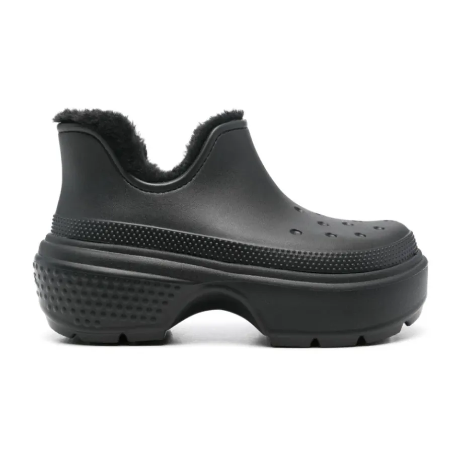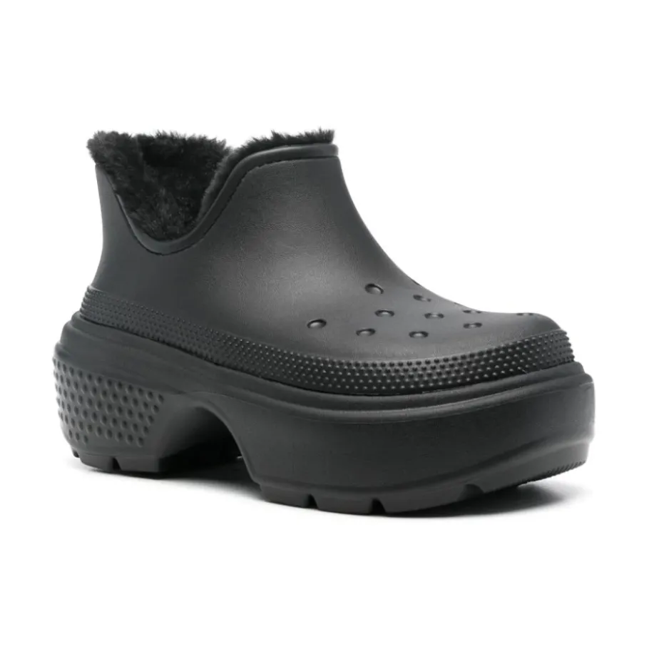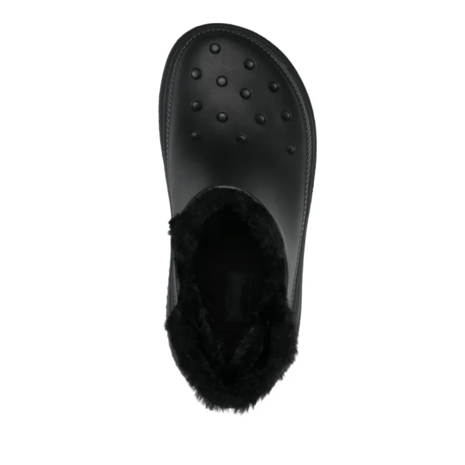 Blijf warm en stijlvol deze winter met deze zwarte lichtgewicht enkellaarsjes van Crocs. Voorzien van een reliëflogo aan de achterkant, geperforeerde neus, ronde neus, imitatiebont voering en platform rubberen profielzool. Gemaakt van 95,70% thermoplastisch en 4,3% polyester.