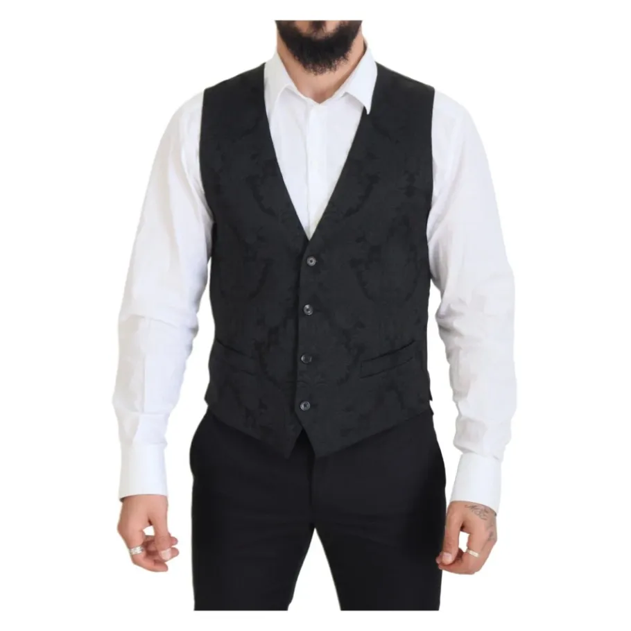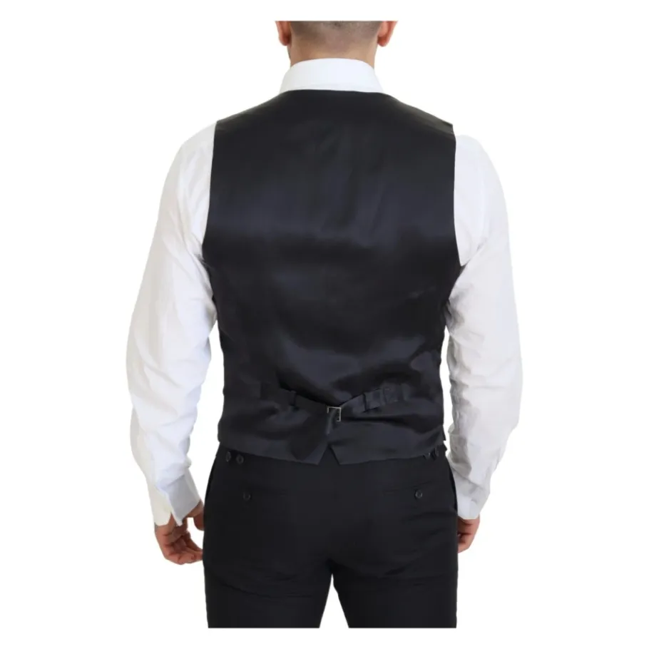 Upgrade je formele garderobe met deze prachtige Dolce Gabbana 2-delige pak jas en vest. Gemaakt in Italië met 56% polyester, 25% acetaat, 17% rayon en 2% elastaan, heeft deze zwarte blazer piek revers en een knoopsluiting. Het vest heeft een volledige knoopsluiting en een verstelbare riem aan de achterkant. Met logo-details en een voering van 90% zijde en 10% viscose, is dit pak 100% authentiek en gloednieuw met tags. Model: MARTINI Style: Enkelborstige 2-delige blazer en vest.
