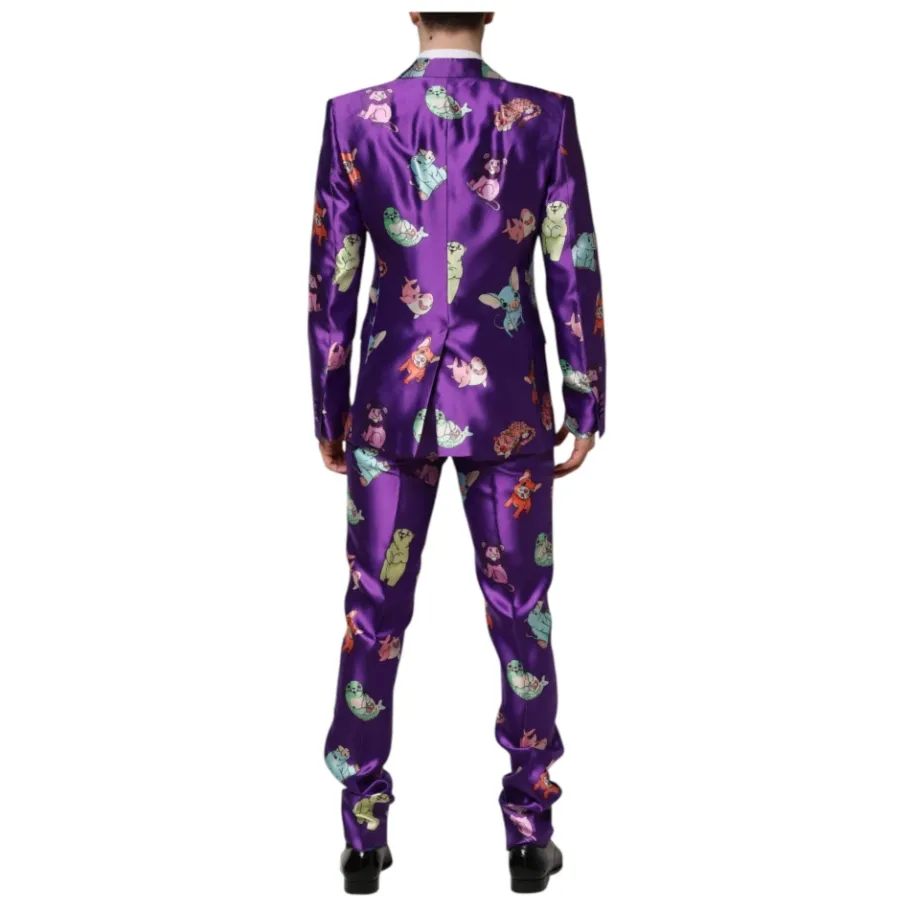 Upgrade je stijl met dit prachtige Dolce & Gabbana 3-delige pak in paars met een multicolor dierenprint. Gemaakt in Italië van 100% zijde, dit slim fit pak heeft een sluiting met twee knopen, binnenzakken en een enkele split aan de achterkant. De set bevat een colbert, broek en een vest met logo details, waardoor het een echt exclusief stuk vakmanschap is.
