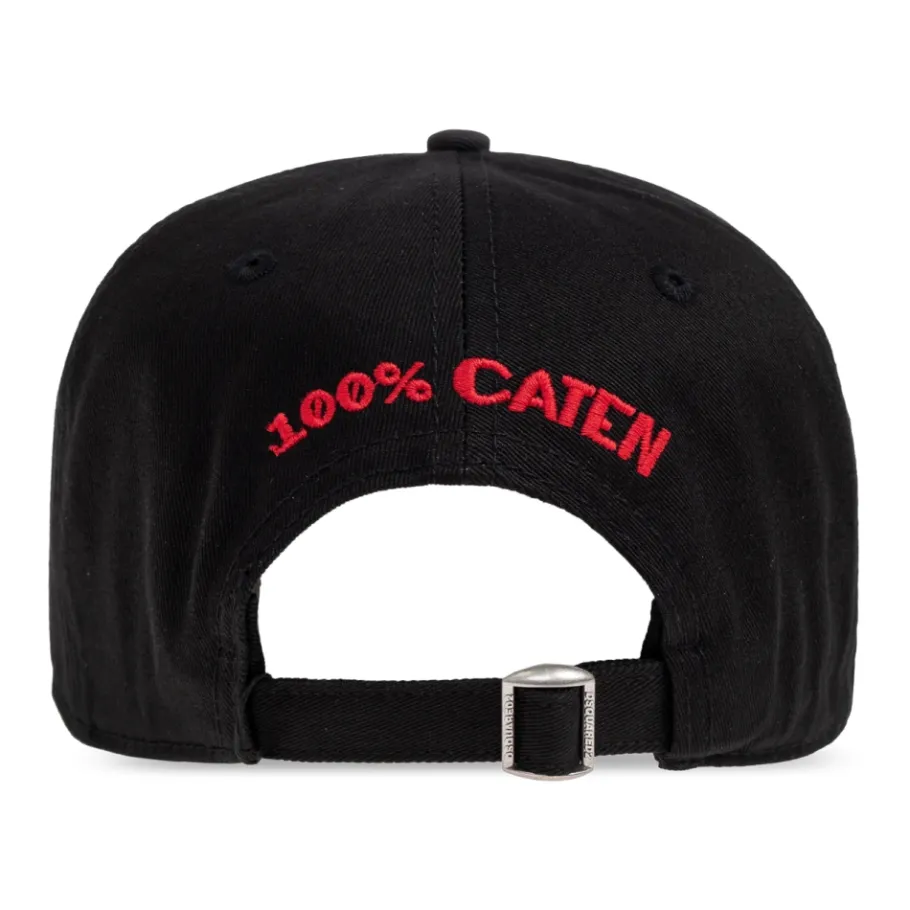De Dsquared2 pet met klep combineert hedendaagse elegantie met street-ready details, benadrukt door een opvallend gevormd voorpaneel en een verhoogde logo-patch. Ideaal voor dagelijks gebruik, waarbij verfijnde branding en een getailleerde pasvorm belangrijk zijn. Belangrijkste kenmerken: Zwart | Katoen | | Slijtvast | Comfortabel om te dragen | Matte afwerking | Verstelbare metalen gesp voor een nauwkeurige pasvorm | Opvallend gevormd voorpaneel | Verhoogde rechthoekige logo-patch met geel-rode rand en gele DSQUARED2 inscriptie | Geborduurde rode “100% CATEN” inscriptie op de achterkant | Gebogen klep | Afmetingen & pasvorm: Verstelbare pasvorm met metalen gesp voor nauwkeurige maatvoering | Samenstelling & onderhoud: 100% katoen