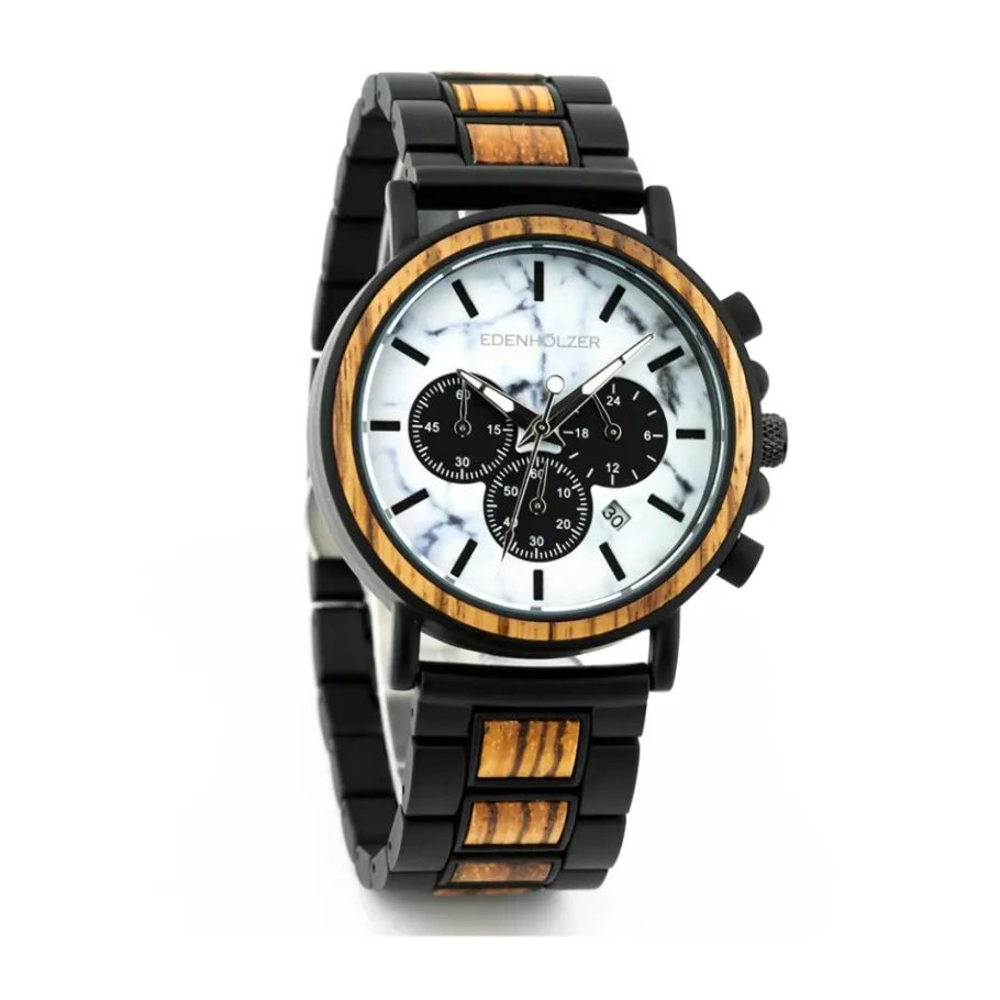 De Edenholzer Bangka ED091-022 Chronograph is een tweekleurig roestvrij stalen en houten horloge met chronograaffunctie. Het combineert een kast van 44 mm en Hardlex-glas met een verstelbare armband en vlindersluiting voor dagelijks gebruik. Belangrijkste kenmerken: Zwart | Bruin | Wit | Roestvrij staal en hout | Waterbestendig 3 bar | Quartz chronograaf uurwerk | Chronograaf (stopwatch) | Datumweergave | Uur-, minuut-, secondewijzers | Verstelbare armband | Vlindersluiting | Chronograaf wijzerplaat | Hardlex glas | Tweekleurige kast | Afmetingen & pasvorm: Diameter kast: 44 mm | Lengte armband: 200 mm | Breedte armband: 22 mm | Gewicht: 94 g | Verstelbare armband | Samenstelling & onderhoud: Roestvrij staal | Hout | Hardlex glas