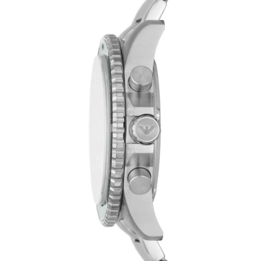 De Emporio Armani Diver Chronograph combineert een roestvrijstalen constructie met een groene wijzerplaat en chronograaffunctie voor nauwkeurige tijdwaarneming en dagelijks gebruik. Belangrijkste kenmerken: Zilver | Groen | Roestvrij staal | Quartz chronograaf uurwerk | Roestvrijstalen armband | Groene wijzerplaat | Zilveren kast | Chronograaf lay-out | Afmetingen & pasvorm: Diameter kast: 43 mm | Lug breedte: 22 mm | Samenstelling & onderhoud: Roestvrij staal