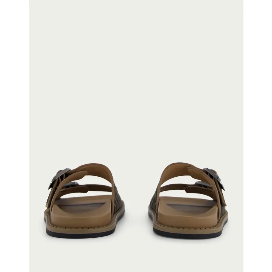 Stap in stijl met deze Fendi Feel Sandalen voor heren. Deze sliders hebben brede en verstelbare banden voor een perfecte pasvorm, gemaakt van hoogwaardige stof met het iconische zwart en tabak jacquard FF-motief. De beige leren zool biedt duurzaamheid en elegantie, terwijl het palladium-finish metaalwerk een luxueuze touch toevoegt. Gemaakt in Italië. Verzorgingsinstructies: Specialistische lederreiniging.