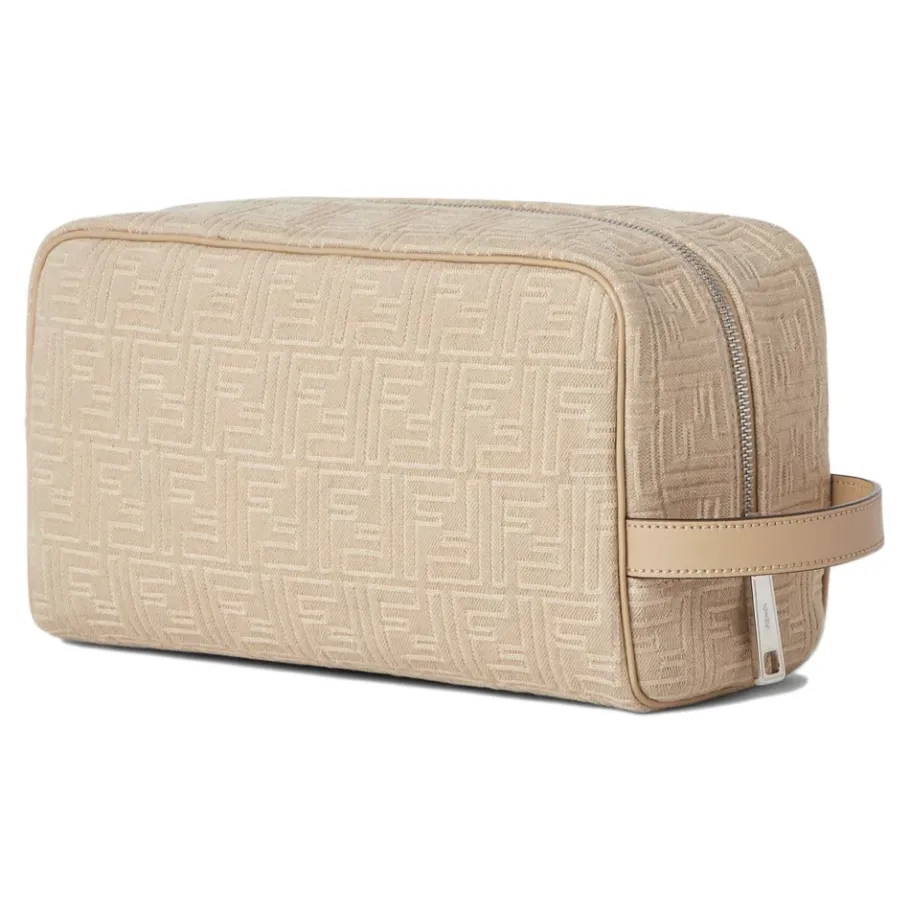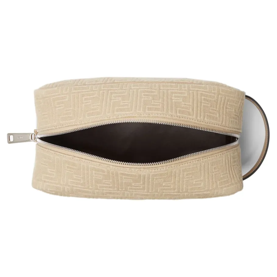Fendi Middelgrote toilettas met rits combineert het kenmerkende FF jacquard met een ritssluiting en een ton-sur-ton leren handvat, ideaal voor het organiseren van cosmetica en kleine benodigdheden. Belangrijkste kenmerken: Beige | Katoen | Wasbare voering | Ritssluiting | Leren handvat aan de bovenkant | Wasbare stoffen voering | Metalen hardware met palladium afwerking | Denim-effect FF jacquard | Toilettas silhouet | Ton-sur-ton leren afwerking | Afmetingen & pasvorm: B 27,5 x H 16 x D 13 cm | Samenstelling & onderhoud: 100% Katoen | Leer
