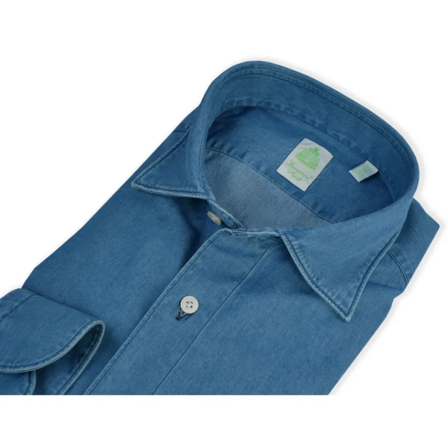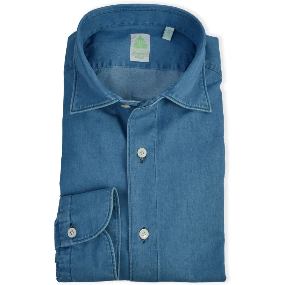 Finamore denim overhemd uit de Gaeta-lijn met een zachte kraag. Napolitaans vakmanschap en onmisbaar comfort zijn de belangrijkste kenmerken van elk Finamore overhemd. Met de hand gemaakt in zeven stappen: kraagstiksels, knoopapplicatie met klassieke leliestiksels, geborduurde knoopsgaten, mouwstiksels, schouderstiksels, nepmouwsteek, mother-of-pearl knoopsluiting en ronde manchet. Gemaakt van 100% katoen.