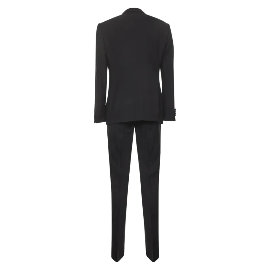 Upgrade je formele look met dit Giorgio Armani single-breasted pak. Gemaakt in Italië van 100% zuivere wol, dit pak heeft zijden satijnen pieklapels, gestructureerde schouders en een strakke zwarte kleur. Perfect voor de moderne man.