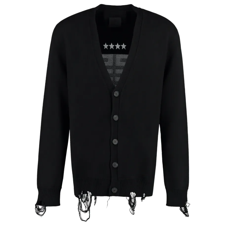 De Givenchy Intarsia Detail Katoenen Cardigan combineert een kenmerkende intarsia op de rug met gerafelde randen voor een opvallend breisel dat ideaal is om in laagjes te dragen. De V-hals, knoopsluiting en lange mouwen maken het een veelzijdig kledingstuk voor smart-casual outfits. Belangrijkste kenmerken: Zwart | Katoen | Knoopsluiting | V-hals | Lange mouwen | Intarsia op de rug | Gerafelde randen | Samenstelling & onderhoud: 100% Katoen | Stomerij