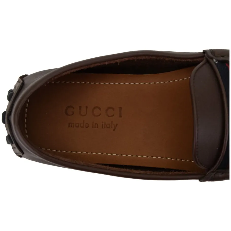 Upgrade je stijl met deze heren loafers van Gucci. Gemaakt van glad leer, hebben deze loafers een band met stoffen banden in de iconische kleuren van het merk en een ‘GG’ logodetail in goudkleurig metaal. Het interieur is gevoerd met suède, terwijl de leren binnenzool het logo van het merk toont. Gemaakt in Italië met een hak van 1 cm en mini rubberen steunen op de zool. Neem contact met ons op voor de maat van de binnenzool!