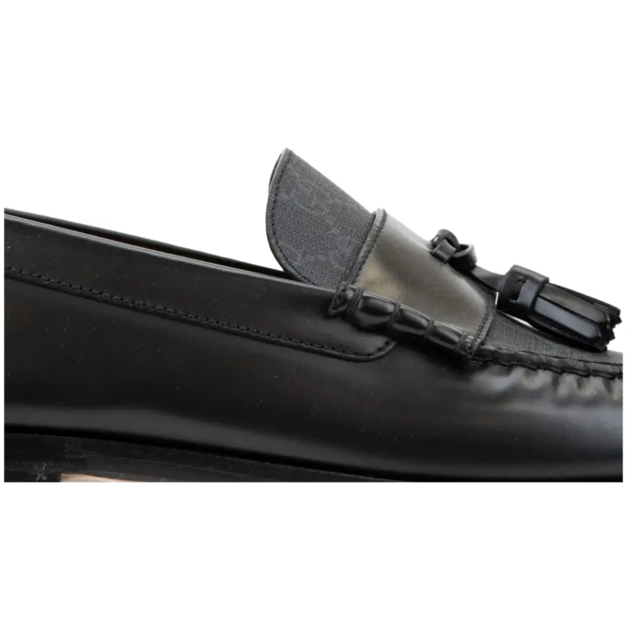 Upgrade je stijl met deze heren loafers van Gucci. Gemaakt in Italië, deze leren loafers hebben een stoffen bovenlaag versierd met het iconische ‘GG’ logo motief. Gedetailleerd met leren franjes aan de voorkant en een hiel van suède leer, bieden deze loafers zowel stijl als comfort. De leren binnenzool is voorzien van het Gucci logo, terwijl de leren zool duurzaamheid garandeert. Neem contact met ons op voor de maat van de binnenzool. Hakhoogte: 2,5 cm.