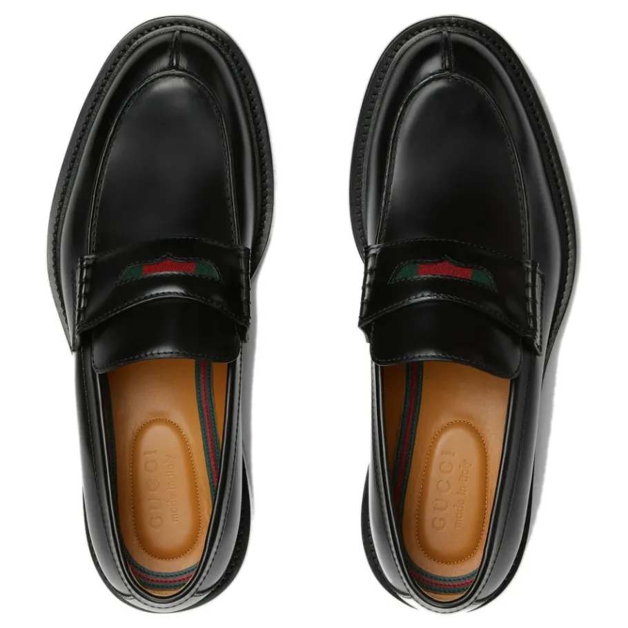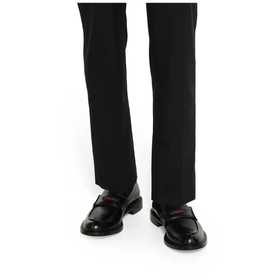 De Gucci Loafer met Web is een zwarte leren loafer met de kenmerkende groene en rode Web-streep van het merk. Het strakke slip-on silhouet past bij zowel smart-casual als formele outfits. Belangrijkste kenmerken: Zwart | Groen | Rood | Leer | Leren zool | Groen en rood Web-detail op de bovenkant | Loafer silhouet | Slip-on constructie | Afmetingen & pasvorm: Zoolhoogte: 20 mm | Samenstelling & verzorging: Leer (bovenkant) | Leren zool | Groen en rood Web (stofdetail) | Bescherm tegen direct licht, hitte en regen. Indien nat, onmiddellijk drogen met een zachte doek. Vul met tissuepapier om de vorm te behouden en bewaar in de meegeleverde flanellen zak en doos. Reinig met een zachte, droge doek of borstel.