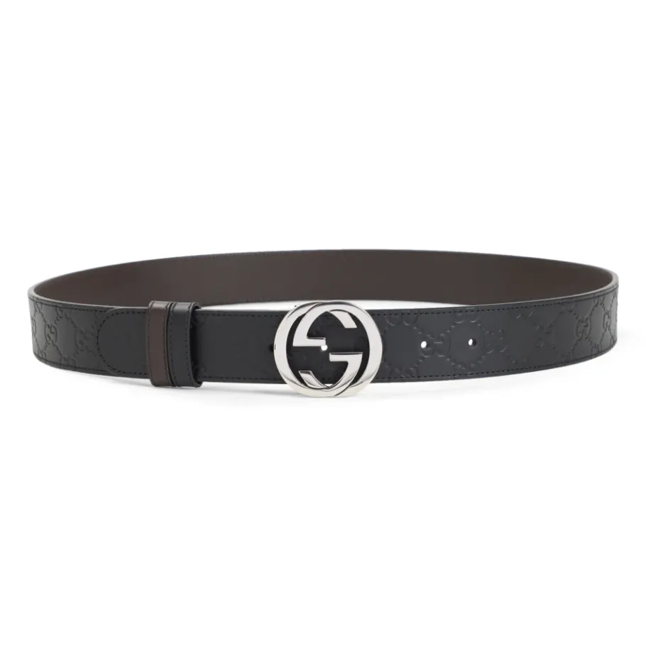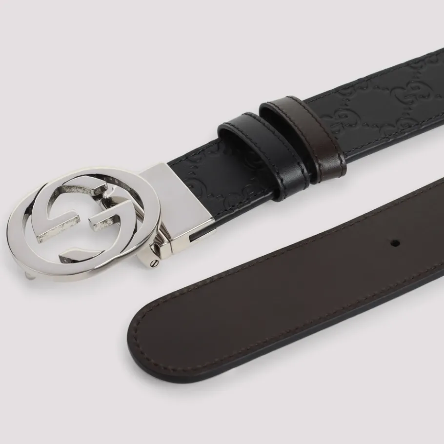 De Gucci omkeerbare zwarte en bruine kalfsleren riem combineert bruin kalfsleer met zwart GG-reliëfleer en een zilverkleurige Interlocking GG-gesp voor een veelzijdig accessoire dat bij elke garderobe past. Belangrijkste kenmerken: Zwart | Bruin | Kalfsleer | Omkeerbaar | Verstelbare pasvorm | Twee leren lussen | Zilverkleurige Interlocking GG-gesp | GG-reliëfleer aan de ene kant | Glad bruin kalfsleer aan de andere kant | Afmetingen & pasvorm: H: 4 cm | Verstelbare pasvorm | Samenstelling & verzorging: Kalfsleer | GG-reliëfleer