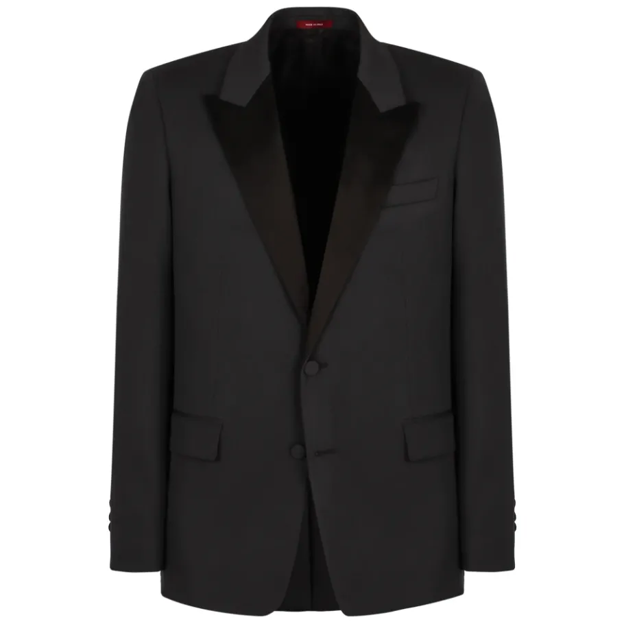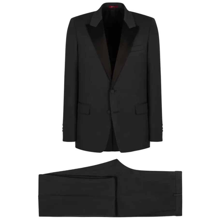 Upgrade je formele look met deze Gucci Single Breasted Suit Set voor heren. De set bevat een single-breasted jasje met twee knopen, een satijnen reverskraag, twee voorflapzakken, borstzak en split aan de achterkant. De broek heeft riemlussen en zijzakken, gemaakt van 98% wol en 2% elastaan.