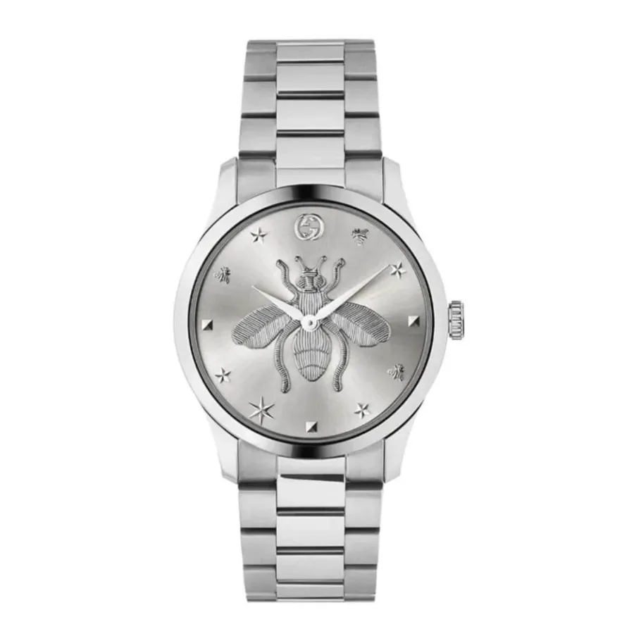 De Gucci YA1264126 horloge combineert Italiaans design met alledaagse functionaliteit. Het horloge heeft een 38 mm roestvrijstalen kast, een zilveren sunray wijzerplaat met een kenmerkend bijenmotief en een roestvrijstalen schakelarmband met 5 ATM waterbestendigheid. Belangrijkste kenmerken: Grijs | Roestvrij staal | Waterbestendigheid: 5 ATM | Geschikt voor dagelijks gebruik | Schakelarmband | Sunray wijzerplaat | Bijenmotief | G-Timeless collectie ontwerp | Afmetingen & pasvorm: Diameter kast: 38 mm | Samenstelling & verzorging: Roestvrij staal | Reinig met een zachte doek; vermijd sterke chemicaliën; droog grondig na contact met water.