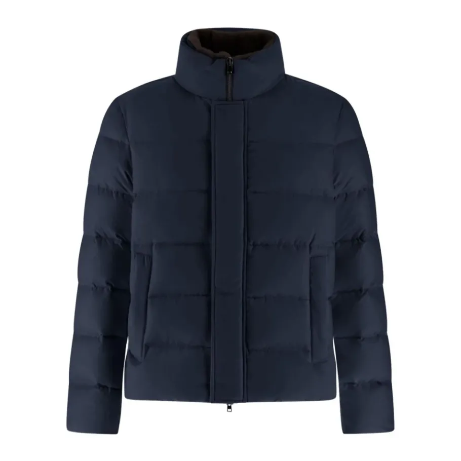 Blijf warm en stijlvol deze winter met deze marineblauwe Herno-jas. Voorzien van een gewatteerd ontwerp met een zilverkleurig logoplaatje, opstaande kraag, verborgen ritssluiting aan de voorkant, twee diagonale zakken, lange mouwen en een rechte zoom.