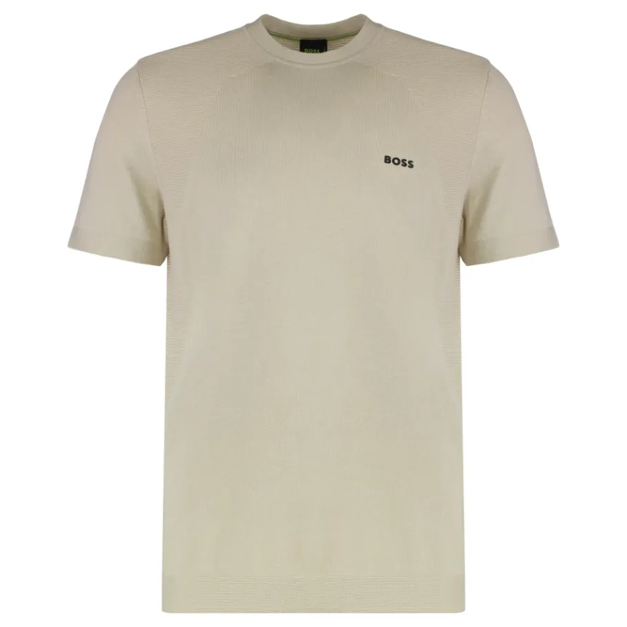 Hugo T-shirt gemaakt van een zachte, lichtgewicht gebreide stof, ideaal voor casual, dagelijks gebruik. Voorzien van een ronde kraag en een subtiel logo aan de voorkant voor veelzijdige styling. Belangrijkste kenmerken: Beige | Katoen | Lichtgewicht stof | Zacht gevoel | Ronde kraag (crew neck) | Korte mouwen | Gebreide constructie | Logo detail aan de voorkant | Samenstelling & onderhoud: 60% Katoen, 40% Polyester | Machinewas koud, droogtrommel laag.