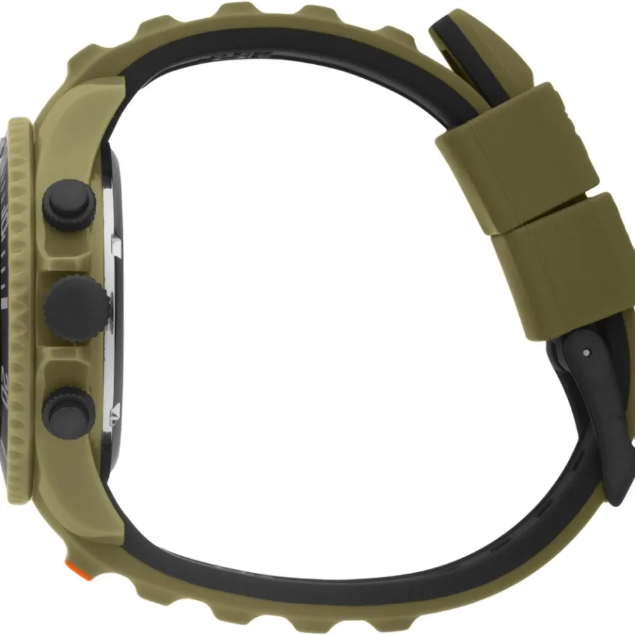 De Ice-Watch Chrono Watch combineert een gedurfd, sportief ontwerp met chronograaffuncties voor dagelijkse timing en actief gebruik. Het horloge valt op door een kaki kast en band gecombineerd met een zwarte wijzerplaat en oranje accenten. Belangrijkste kenmerken: Kaki | Zwart | Oranje | Biopolymeer | 10 ATM waterbestendigheid | Quartz chronograaf uurwerk (Miyota JS25) | Chronograaf (stopwatch) functie | Datumweergave | Uren, minuten, seconden | Gespsluiting | Schroefdeksel van roestvrij staal | Kaki kast en siliconen band | Zwarte wijzerplaat met oranje wijzers en accenten | Zwarte aluminium bezel | Gestructureerde siliconen band | Afmetingen & pasvorm: Diameter kast: ca. 40 mm | Samenstelling & onderhoud: Biopolymeer kast | Aluminium bezel | Siliconen band | Mineraalglas | Roestvrijstalen achterkant en gesp