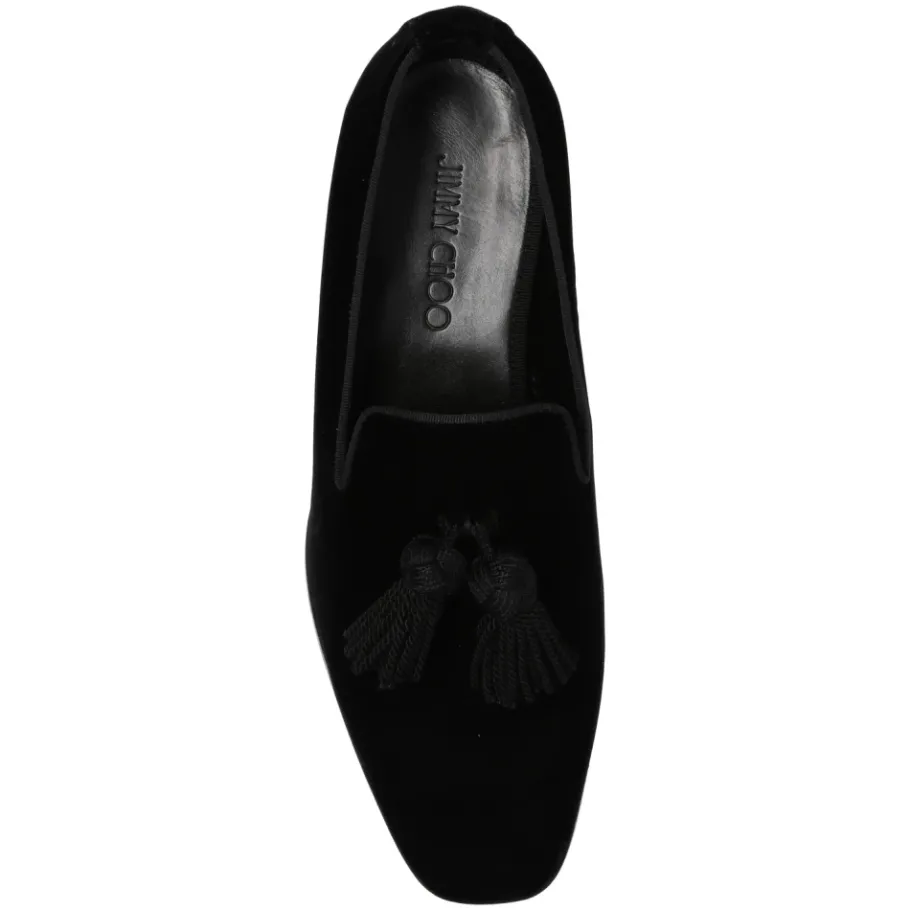 De Foxley Velvet Mocassins van Jimmy Choo zijn een verfijnde keuze voor elke garderobe, met een luxueuze, fluweelachtige stof en decoratieve kwastjes voor een vleugje elegantie. Belangrijkste kenmerken: Zwart | Fluweelachtige stof | Decoratieve kwastjes |