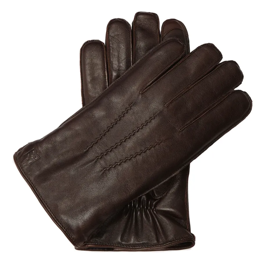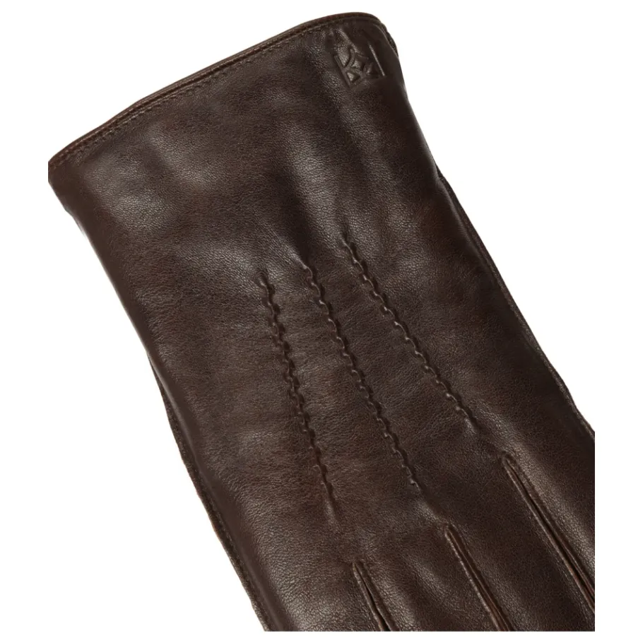 Donkerbruine herenhandschoenen zijn gemaakt van glad, hoogwaardig natuurlijk leer, wat zorgt voor een elegant en verfijnd uiterlijk. Een kenmerkend kenmerk van deze handschoenen is de decoratieve stiksels aan de voorkant, wat bijdraagt aan hun unieke karakter en het zorgvuldige vakmanschap benadrukt. De handschoenen zijn uitgerust met touchscreentechnologie, zodat u vrijelijk telefoons of tablets kunt gebruiken zonder ze uit te hoeven doen. Er is een reliëf KAZAR-logo bij de pols, wat hun prestige verder versterkt en ze tot een uitstekende keuze maakt voor degenen die merkgebonden, functionele accessoires waarderen.