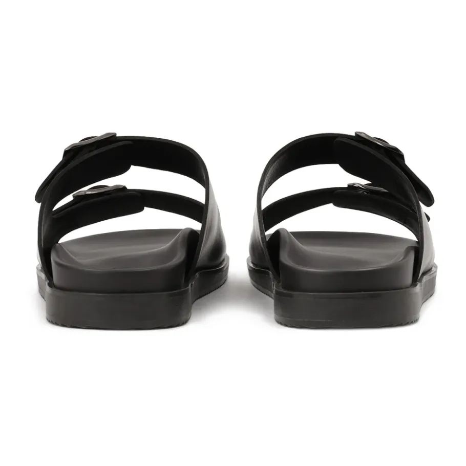 Zwarte teenslippers gemaakt van natuurlijk leer zijn een stijlvol en comfortabel model, ideaal voor zomerdagen. Ze onderscheiden zich door een dikke, rechte zool, die stabiliteit en draagcomfort biedt. Het bovenwerk bestaat uit twee verstelbare banden, waarmee je ze aan je voet kunt aanpassen. Metalen gespen voegen een licht industrieel, modern tintje toe aan de schoenen, terwijl ze hun stevigheid en duurzaamheid benadrukken. Dankzij het minimalistische ontwerp en de functionaliteit is het gepresenteerde schoeisel een uitstekende keuze voor dagelijks gebruik, waarbij comfort wordt gecombineerd met een mannelijke, elegante stijl.