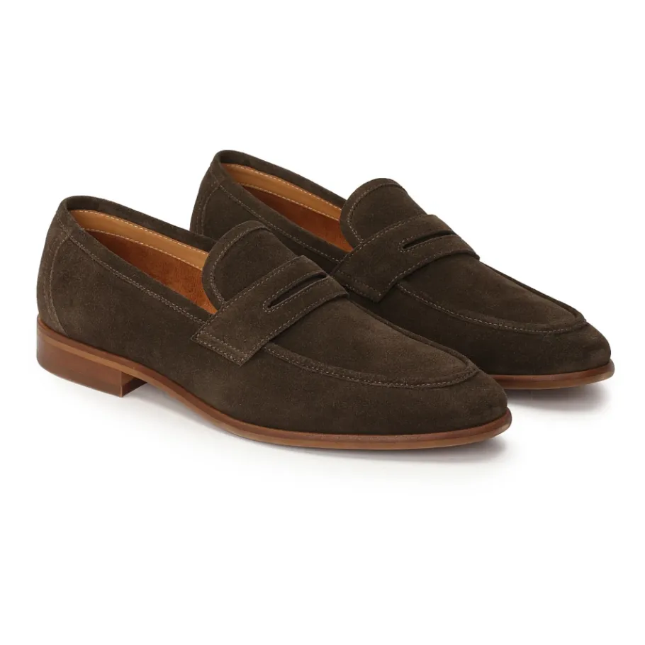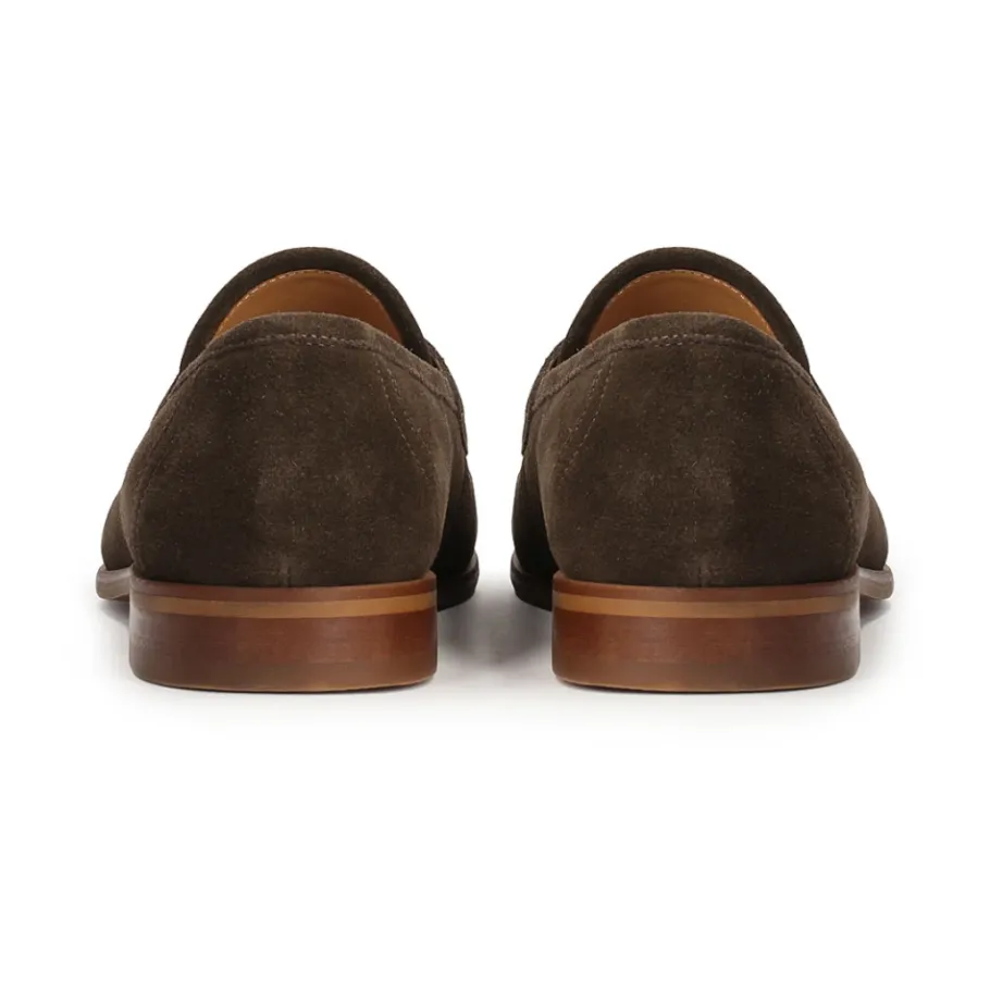 Bruine heren loafers gemaakt van suède zijn stijlvolle instapschoenen, ideaal voor minder formele gelegenheden. Het zachte, matte suède zorgt voor een elegante uitstraling, en de band aan de voorkant met een gat verwijst naar klassieke mocassins. Dankzij de instap snit zijn de schoenen comfortabel en gemakkelijk te dragen. De lichtere bruine zool, die hout imiteert, voegt een moderne touch en lichtheid toe, die harmonieus samengaat met het bovenwerk. De getoonde loafers passen goed bij smart-casual outfits, zoals chino’s, lichte pakken of jeans, waarbij stijl wordt gecombineerd met alledaags comfort. De leren voering is niet alleen luxueus, maar zorgt ook voor uitstekende ventilatie en comfort de hele dag door.