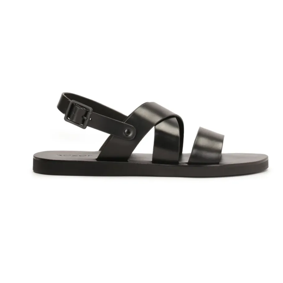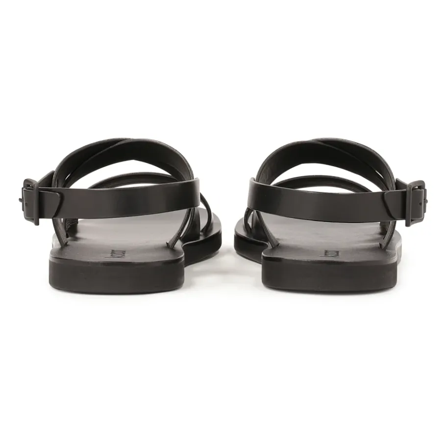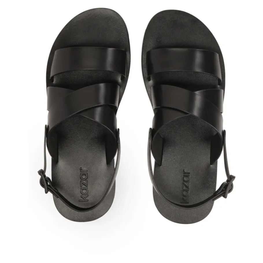 Gemaakt van hoogwaardig natuurlijk leer, de zwarte sandalen hebben een modern maar toch klassiek ontwerp. Er zijn drie brede banden aan de voorkant van de schoen, die niet alleen de voet stevig vasthouden, maar ook bijdragen aan de elegante uitstraling van de sandalen. Een bandsluiting aan de hiel met een solide metalen gesp zorgt voor een gemakkelijke en veilige pasvorm om de voet. Het geheel is geplaatst op een eenvoudige, platte zool, die comfort en lichtheid van stap garandeert. Het interieur van de schoen, gevoerd met natuurlijk leer, garandeert hygiënische omstandigheden en hoog draagcomfort.