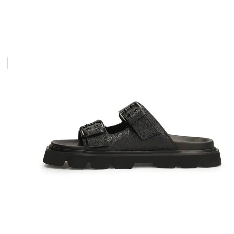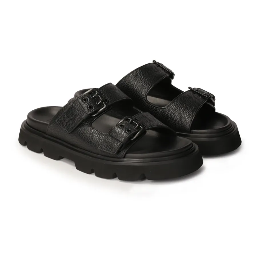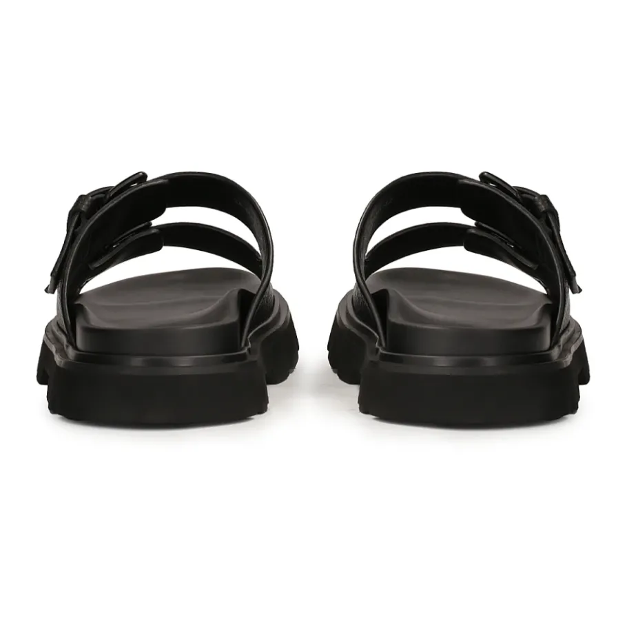 Zwarte teenslippers gemaakt van natuurlijk leer zijn een elegant en functioneel voorstel, ideaal voor warme dagen. Ze zien er klassiek en stijlvol uit, terwijl ze duurzaamheid en comfort bieden. Het model onderscheidt zich door twee brede banden met verstelbare gespen, waardoor een nauwkeurige pasvorm aan de voet mogelijk is. De gespen, gehouden in een minimalistische stijl, benadrukken het moderne karakter van het schoeisel, terwijl ze gemak bieden bij het aan- en uittrekken. De dikke, zachte zool gemaakt van flexibel materiaal biedt uitstekende demping, beschermt de voeten tegen vermoeidheid zelfs bij langdurig dragen. Het algehele ontwerp in diep zwart geeft de teenslippers een veelzijdig karakter, waardoor ze perfect passen bij zowel casual outfits als meer elegante zomersets. Ze zijn een praktische en stijlvolle keuze voor mannen die comfort en klassieke esthetiek waarderen.