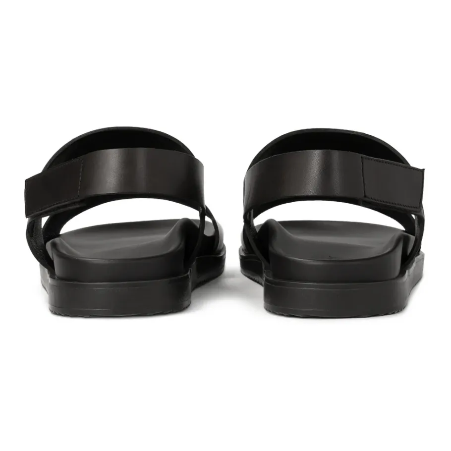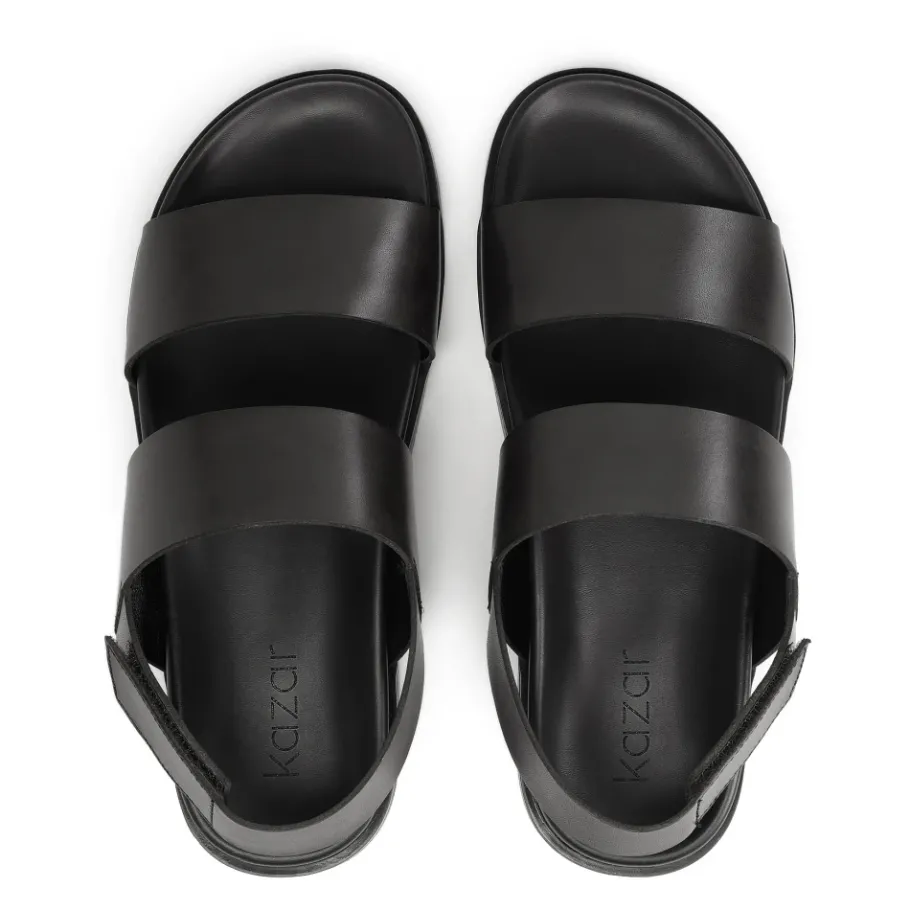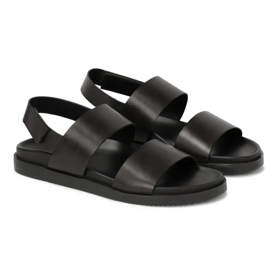 Natuurlijke leren sandalen in een klassieke zwarte kleur zijn een combinatie van stijl en comfort. Twee brede banden aan de voorkant zorgen voor een stevige grip op de voet, terwijl een extra band achter de hiel met een klittenbandsluiting zorgt voor een nauwkeurige pasvorm. De dikke zool garandeert demping en comfort, waardoor deze sandalen de perfecte keuze zijn voor zomerdagen. Het strakke ontwerp werkt goed met zowel stedelijke styling als vakantie uitstapjes.