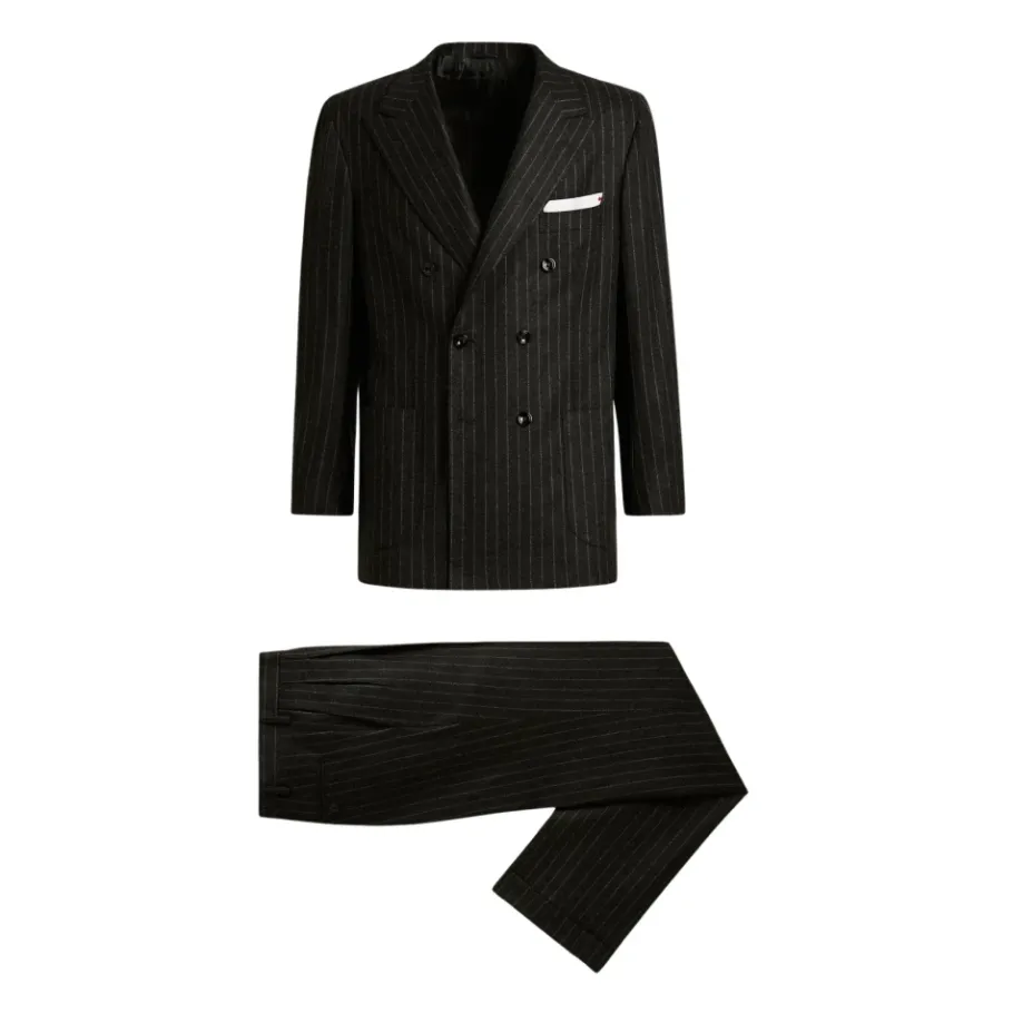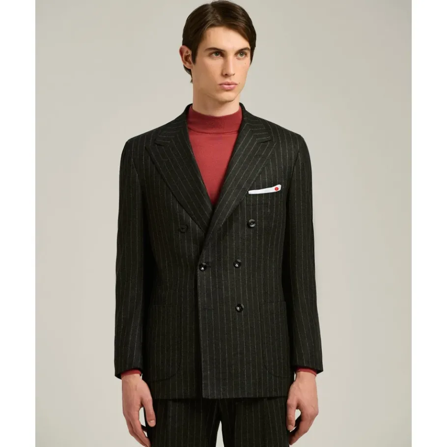 Maak een statement van elegantie met dit Kiton double-breasted pak. Met de hand vervaardigd in Napels met een mix van wol en kasjmier, combineert het tijdloos krijtstreep patroon met moderne stijl. Elk detail weerspiegelt 25 uur handenarbeid voor een onberispelijke silhouet.
