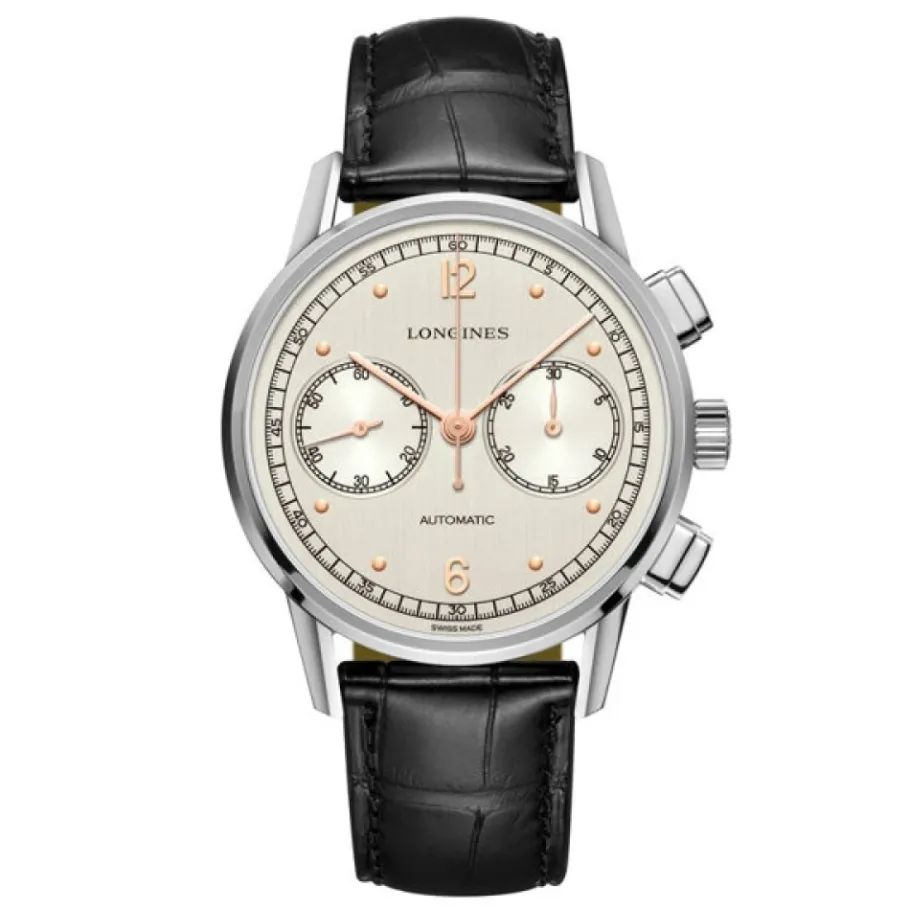 Verhoog je stijl met de LONGINES L28144760 heritage chronograaf 41 mm horloge voor heren. Dit automatische horloge heeft een beige wijzerplaat, roestvrijstalen kast, 41 mm diameter, 3 Bar waterbestendigheid, saffierglas, zwarte leren band en stalen gesp.