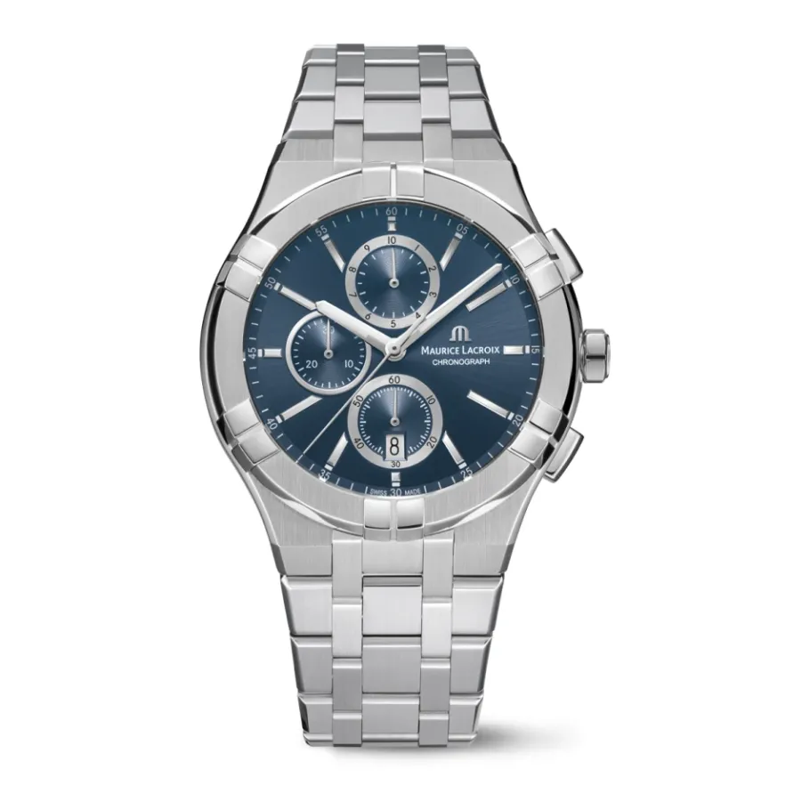 De Maurice Lacroix Aikon Quartz Chronograph combineert een donkerblauwe wijzerplaat met een sun-brushed afwerking met een robuuste roestvrijstalen kast en armband. Het quartz chronograaf uurwerk, saffierglas en de waterbestendigheid tot 10 ATM maken het een praktische keuze voor dagelijks gebruik en actieve bezigheden. Belangrijkste kenmerken: Donkerblauw | Staal | Roestvrij staal | Waterbestendigheid 10 ATM | Saffierglas | Quartz uurwerk | Chronograaf met 30-minuten- en 1/10 secondentellers | Datum op 6 uur | Eenvoudig verwisselbaar armband systeem | Sun-brushed wijzerplaat met rodium tellerringen | Lunette met zes-klauw design | Gerhodineerde indexen en wijzers | Geborstelde en gepolijste kastafwerking | Afmetingen & pasvorm: Kastdiameter: 42 mm | Kasthoogte: 11 mm | Armbandbreedte: 25 mm | Samenstelling & verzorging: Roestvrij staal | Saffierglas | Quartz uurwerk | Gerhodineerde details | Afnemen met een zachte doek. Vermijd oplosmiddelen en langdurige blootstelling aan extreme temperaturen. Laat de batterij en afdichtingen onderhouden door een erkend servicecentrum.