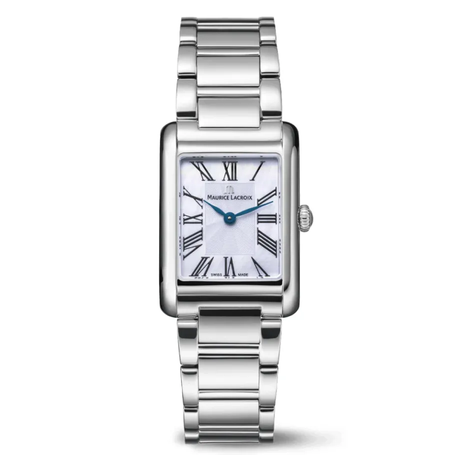 De Maurice Lacroix Fiaba Square is een elegant rechthoekig horloge dat een witte parelmoeren wijzerplaat combineert met een gepolijste roestvrijstalen armband. De verfijnde details en compacte afmetingen maken het ideaal voor zowel formele als alledaagse gelegenheden. Belangrijkste kenmerken: Wit | Zilver | Roestvrij staal | Waterbestendig tot 5 ATM | Saffierglas met anti-reflecterende coating | Quartz uurwerk | Eenvoudig verwisselbaar armband systeem | Parelmoeren wijzerplaat met centraal flinqué motief | Romeinse cijfer uurmarkeringen | Blauw vergulde wijzers | Gepolijste rechthoekige kast | Afmetingen & pasvorm: Kastdiameter: 24.00 x 34.00 mm | Kasthoogte: 6.5 mm | Samenstelling & onderhoud: Roestvrij staal | Parelmoer | Saffierglas