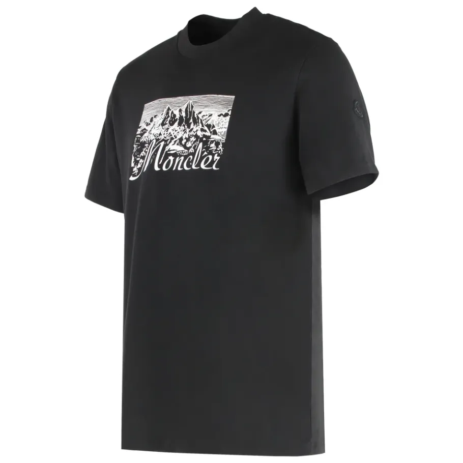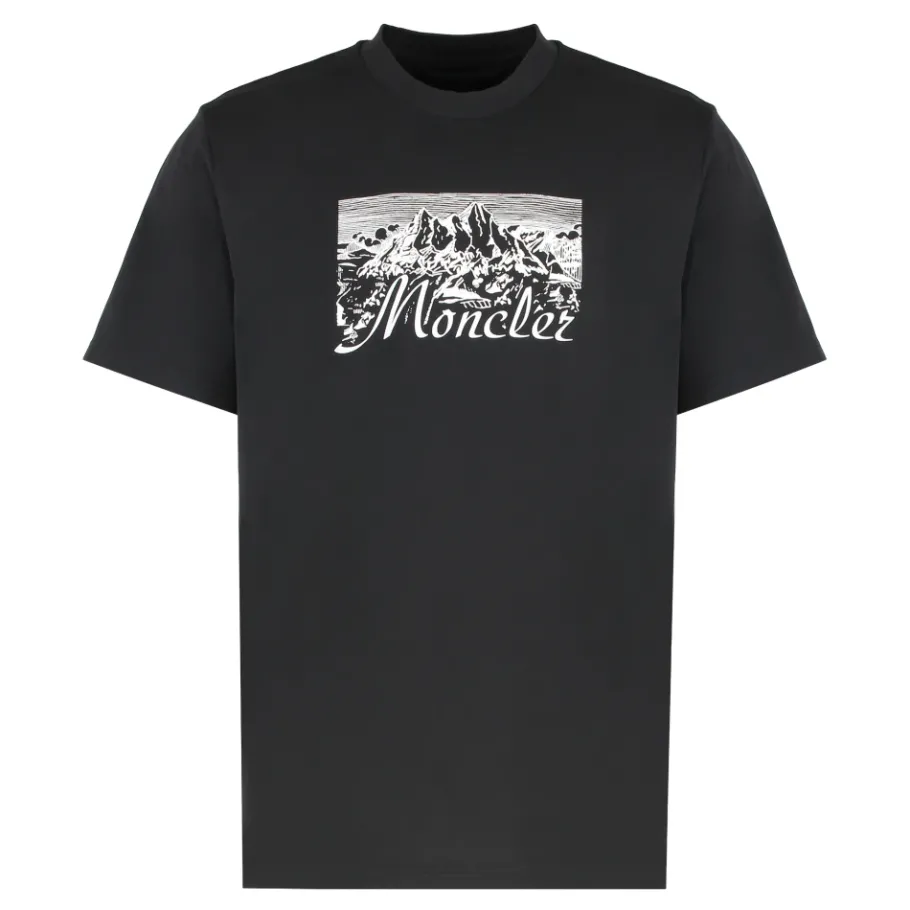 Het Moncler Mountain Logo Cotton T-Shirt is een T-shirt met korte mouwen, ontworpen voor dagelijks gebruik, met een op de bergen geïnspireerd geprint logo voor een moderne, casual look. Belangrijkste kenmerken: Zwart | Katoen | Ademende stof | Zachte katoenen jersey | Machinewasbaar | Gemakkelijk te combineren | Ronde hals | Korte mouwen | Geprint berglogo | Silicone logo patch | Afmetingen & pasvorm: Regular fit | Samenstelling & verzorging: 100% katoen | Machinewas koud (max. 30°C) mild programma; niet bleken; niet in de droogtrommel; strijken max. 110°C zonder stoom; niet chemisch reinigen; professioneel nat reinigen (mild); plat drogen in de schaduw.