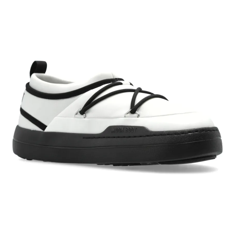 Maak kennis met de MB PARK ICON SNOW BOOTS van Moon Boot, die perfect moderne stijl en functionaliteit combineren. Gedomineerd door wit met zwarte accenten, trekken deze uitzonderlijke sneeuwlaarzen de aandacht met hun esthetiek en unieke ontwerp. Gemaakt van vochtbestendig synthetisch materiaal, bieden ze comfort en bescherming in alle weersomstandigheden. De lage schacht, geïnspireerd op klassieke sneakers, is versterkt met een dikke zwarte rubberen zool die uitstekende isolatie biedt tegen koude oppervlakken. Zwarte veters creëren een onderscheidend patroon, en de