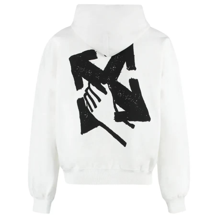 De Off-White Hand Arrow Boxy Hoodie heeft een opvallende print op de rug en een boxy katoenen silhouet, ideaal voor casual laagjeslooks en streetwear styling. Belangrijkste kenmerken: Wit | Zwart | Katoen | Verstelbare capuchon met trekkoord | Kangoeroezak | Print op de rug | Grafische print op de borst | Geribde manchetten en onderkant | Afmetingen en pasvorm: Boxy fit | Samenstelling en verzorging: 100% katoen | Machinewas op 30°C